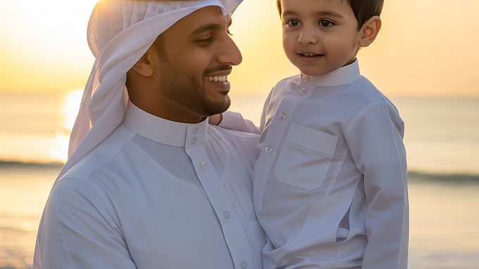 A Saudi father shares a heartwarming moment with his young son on the beach during a golden sunset