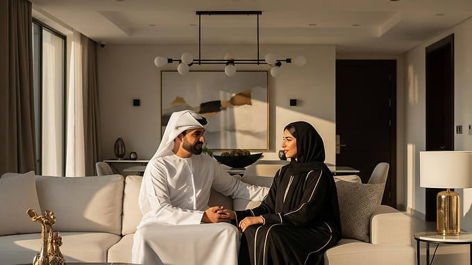 An Emirati husband and wife sitting and talking together on the sofa of a living room in a villa holding hands